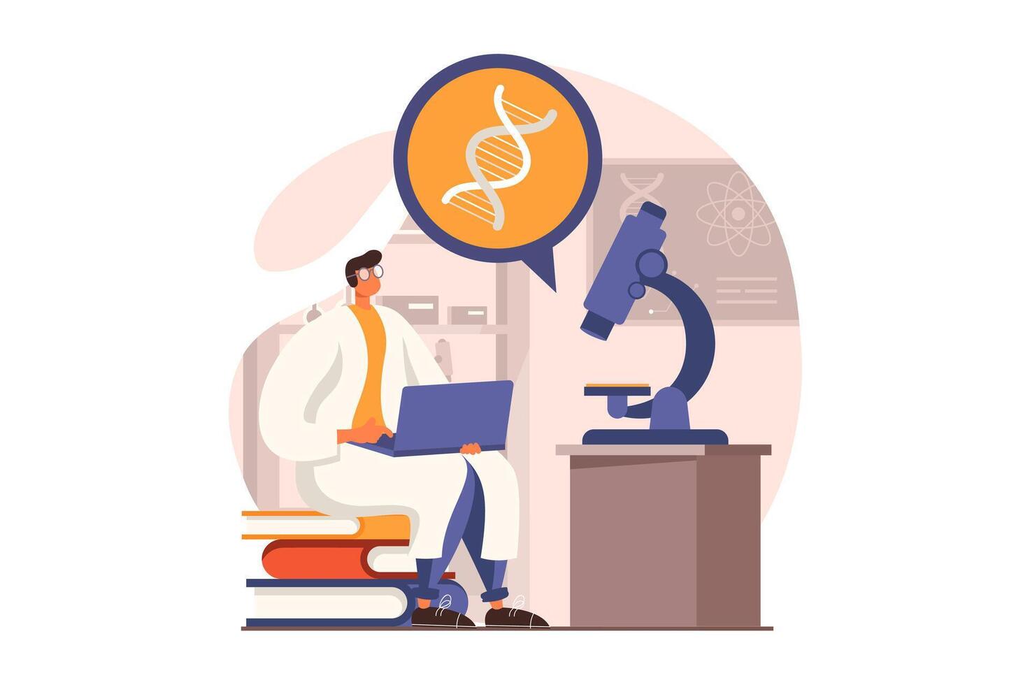 Science laboratory web concept in flat design. Man scientist making test on microscope and examines DNA molecule and processing research results on laptop. illustration with people scene Pro Vector