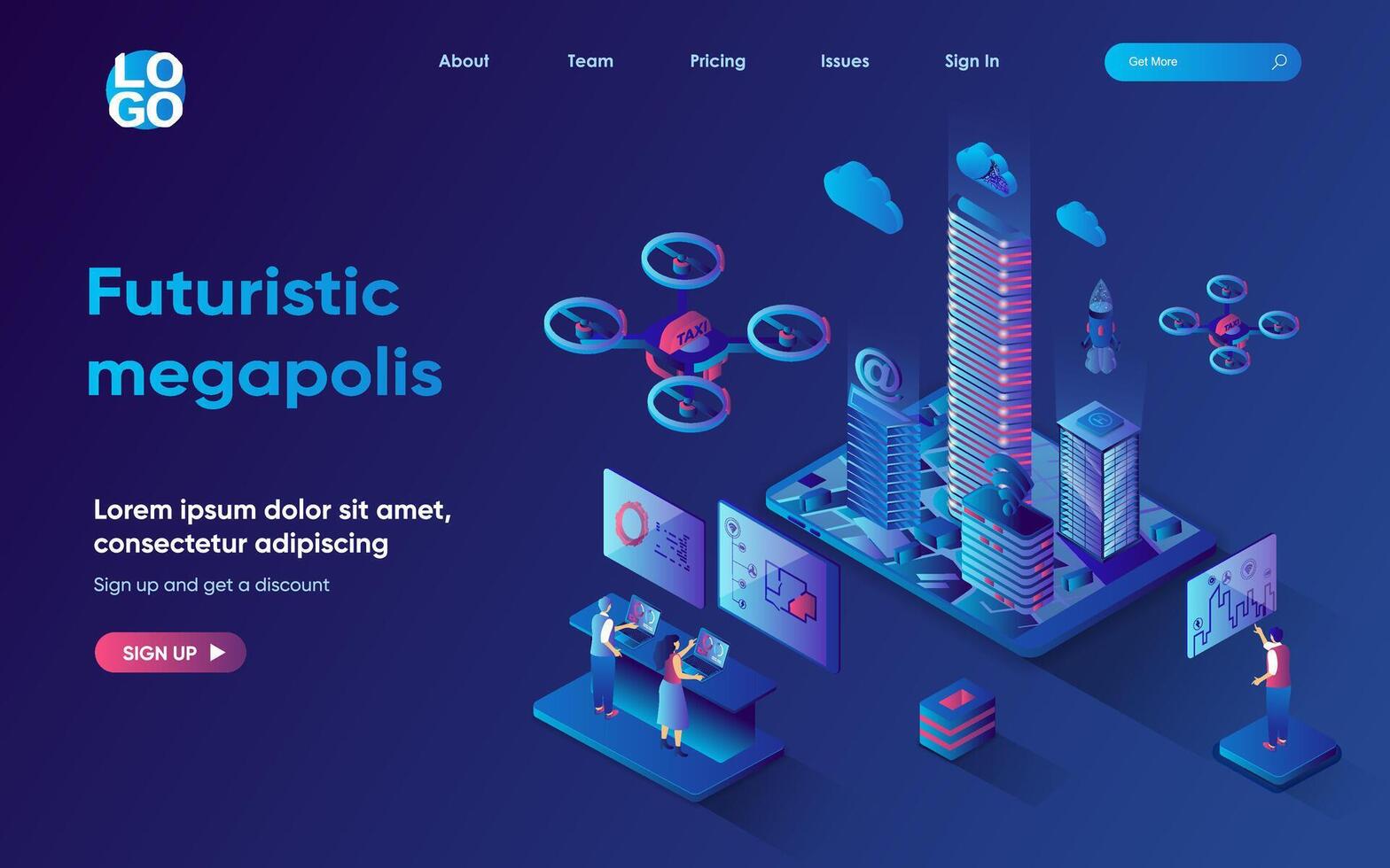 Futuristic megapolis concept 3d isometric web landing page. People monitor indicators and control hi-tech technologies and infrastructure in smart city. illustration for web template design Pro Vector