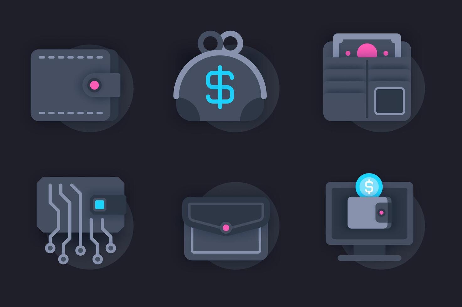 Wallet web concept of 3d paper icons set. Pack flat pictograms of cash storage in different wallets, online transactions, payment for purchases and others. elements for website in dark style Pro Vector