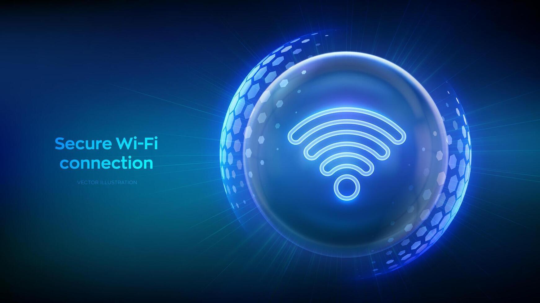 Wi-Fi network icon inside transparent protection sphere shield with hexagon pattern on blue background. Secure Wi Fi wireless network connection. Cyber Security. Wifi Encryption. illustration. Pro Vector