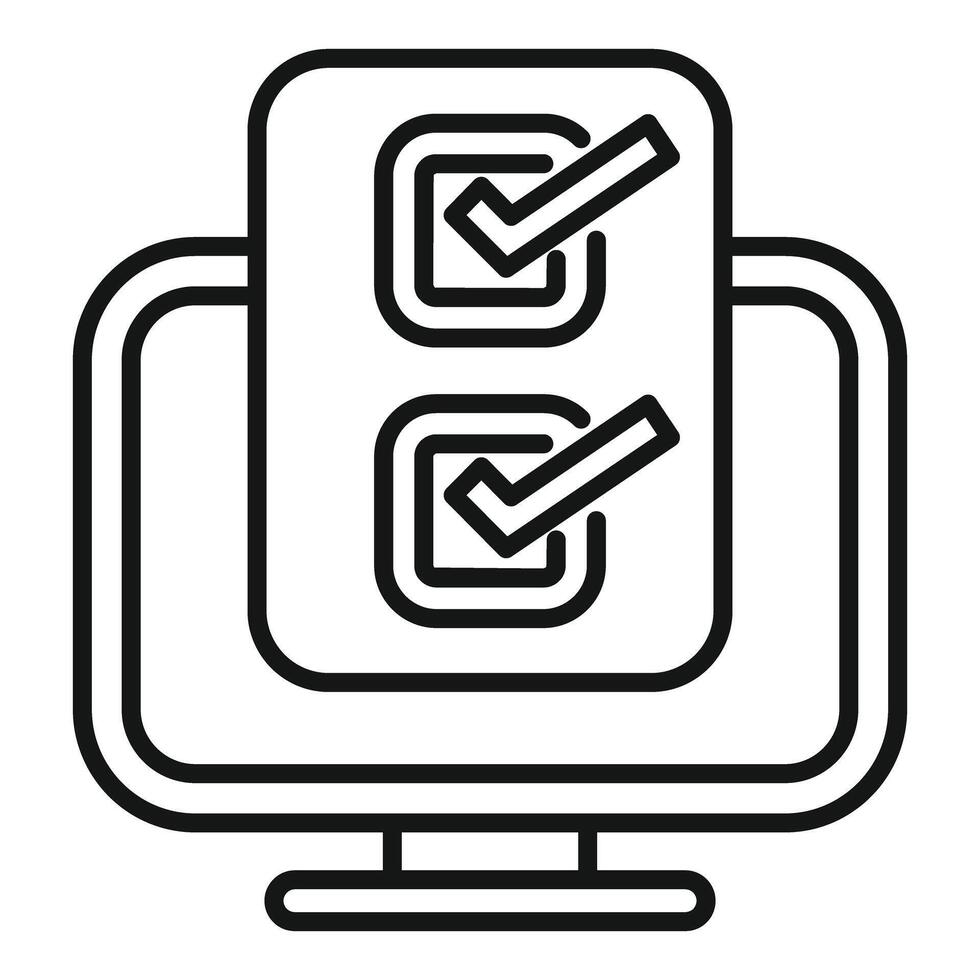 Line art icon of a computer monitor displaying checkmarks, symbolizing online survey or form completion Pro Vector