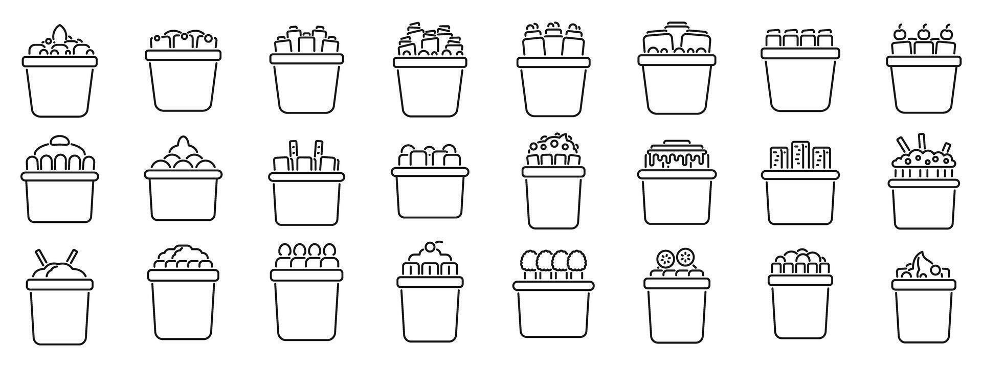 Stir fried ice cream outline icons. A series of white boxes with various items inside Pro Vector