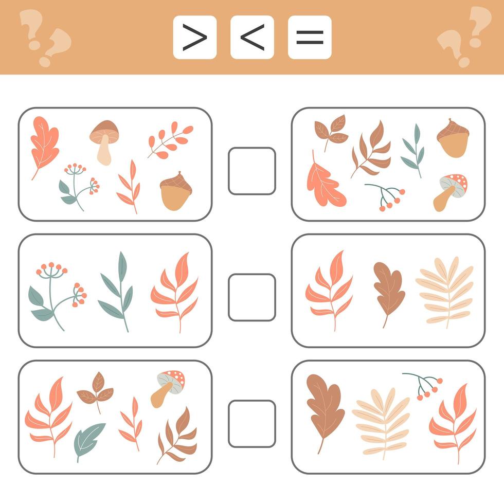 Comparing numbers. Less than, greater than, equal. Forest Autumn leaves Pro Vector