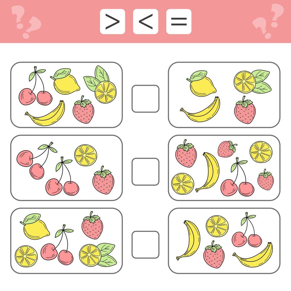 Less than, greater than, equal. Count as many fruits in the picture Pro Vector