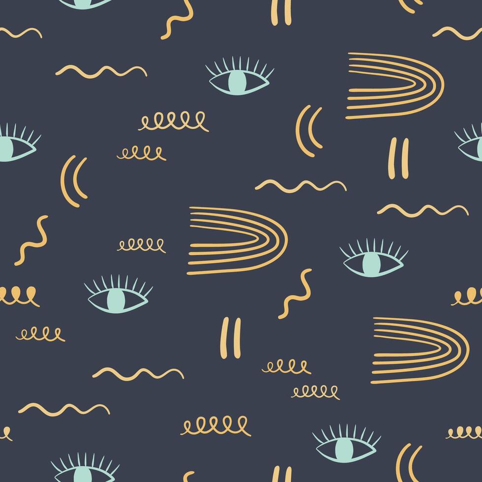 Abstract y2k background. Seamless pattern with eye and doodle textures on navy backdrop. Hand drawn illustration. Pro Vector