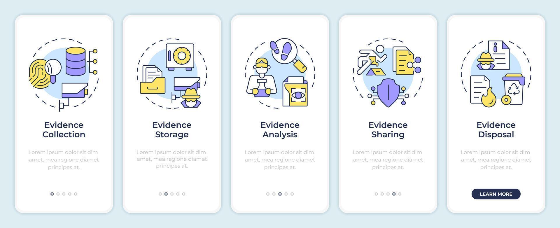 Evidence lifecycle onboarding mobile app screen. Walkthrough 5 steps editable graphic instructions with linear concepts. UI, UX, GUI template Pro Vector