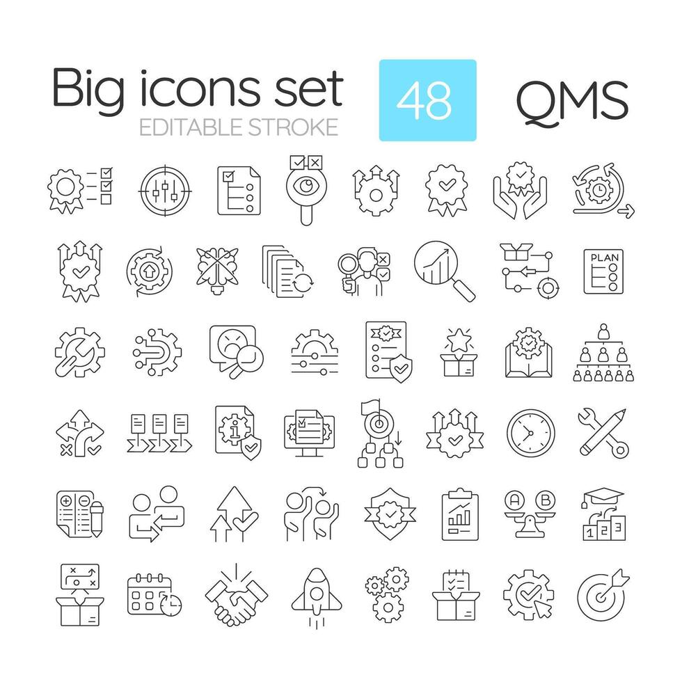 QMS linear icons set. Performance improvement. Measurable goals, accountability. Lean management. Customizable thin line symbols. Isolated outline illustrations. Editable stroke Pro Vector