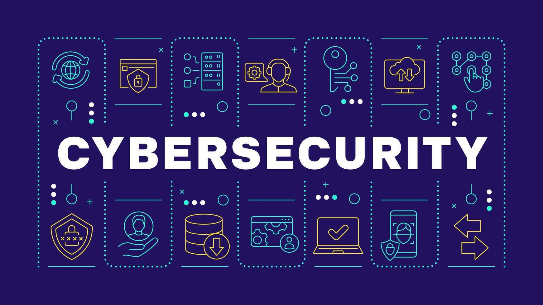 Cybersecurity dark blue word concept. Face recognition, data privacy. Cloud communication management. Horizontal image. Headline text surrounded by editable outline icons Pro Vector