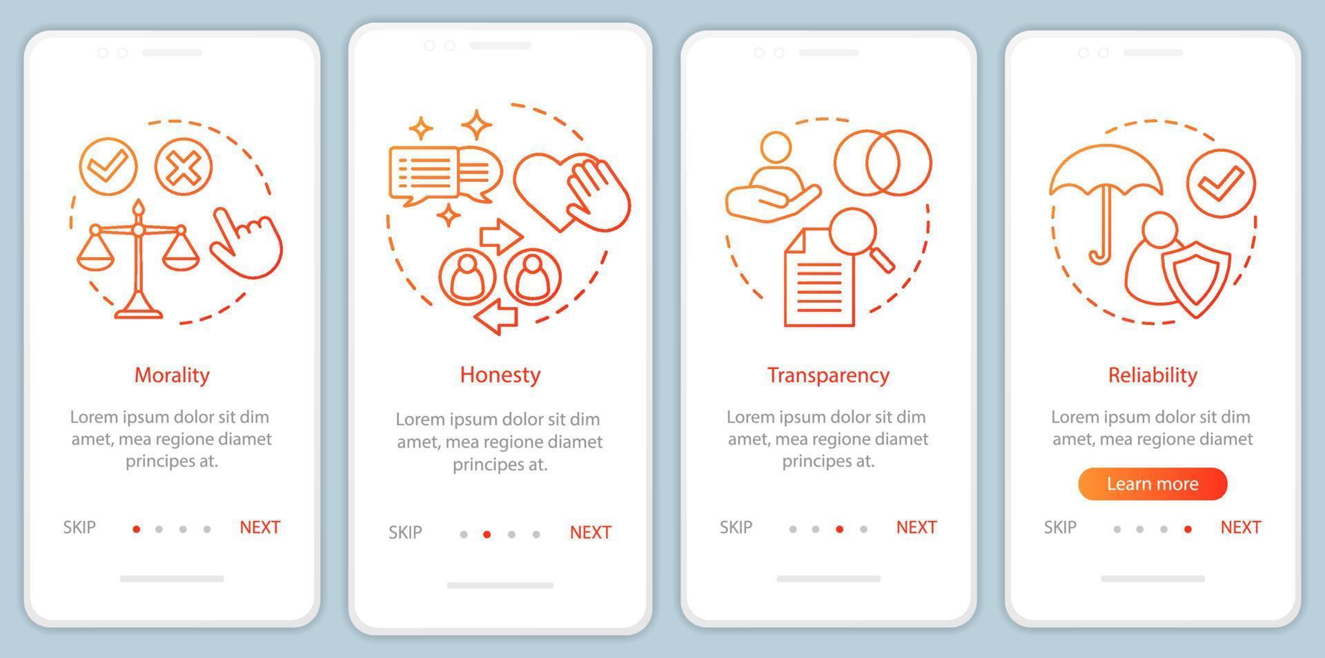 Ethical principles onboarding mobile app page screen vector template. Morality, transparency, reliability. Walkthrough website steps with linear illustrations. UX, UI, GUI smartphone interface concept Pro Vector and Pro SVG
