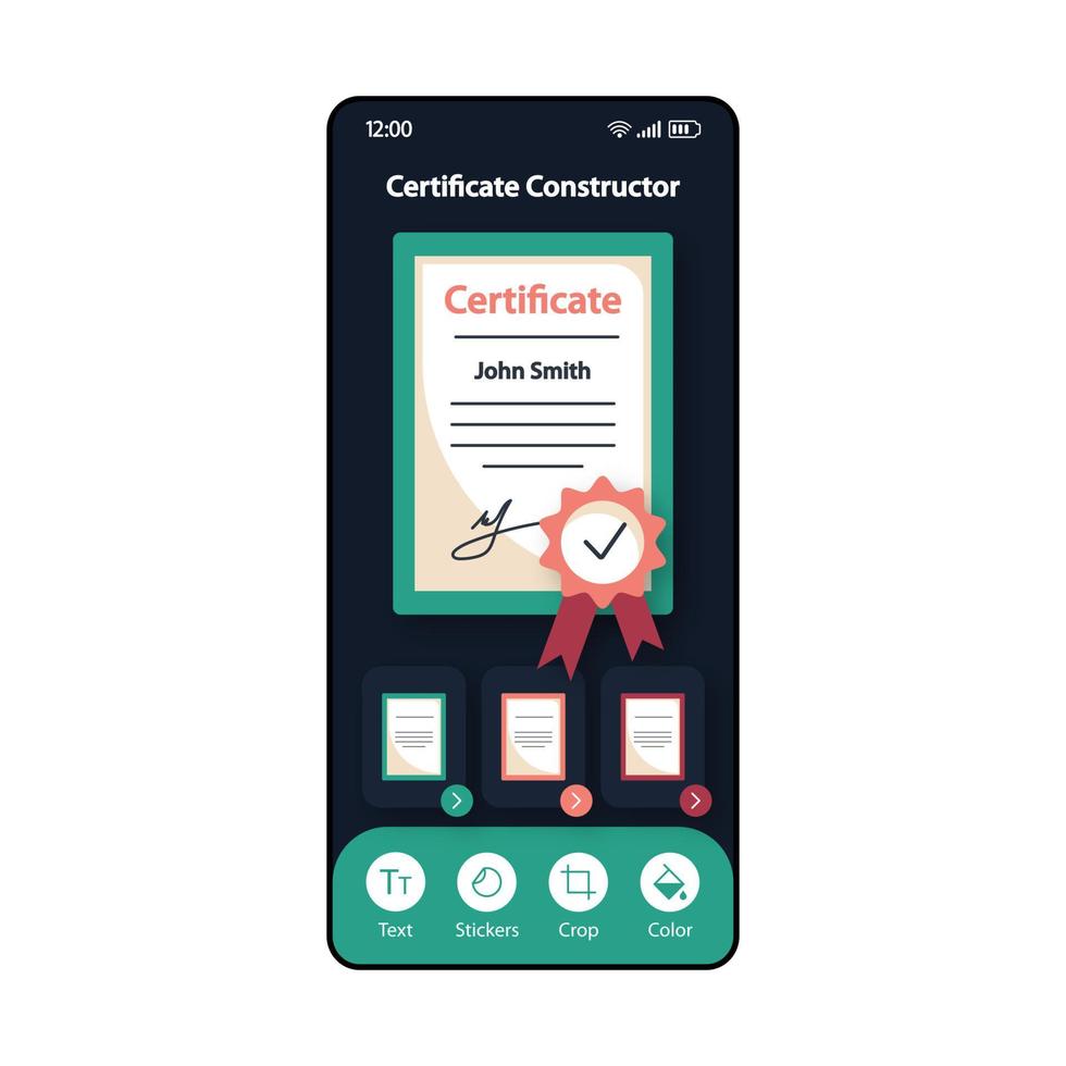 Certificate constructor smartphone interface vector template. Mobile app page black design layout. Education documents editing screen. Flat UI for application. Diploma. Phone display Pro Vector