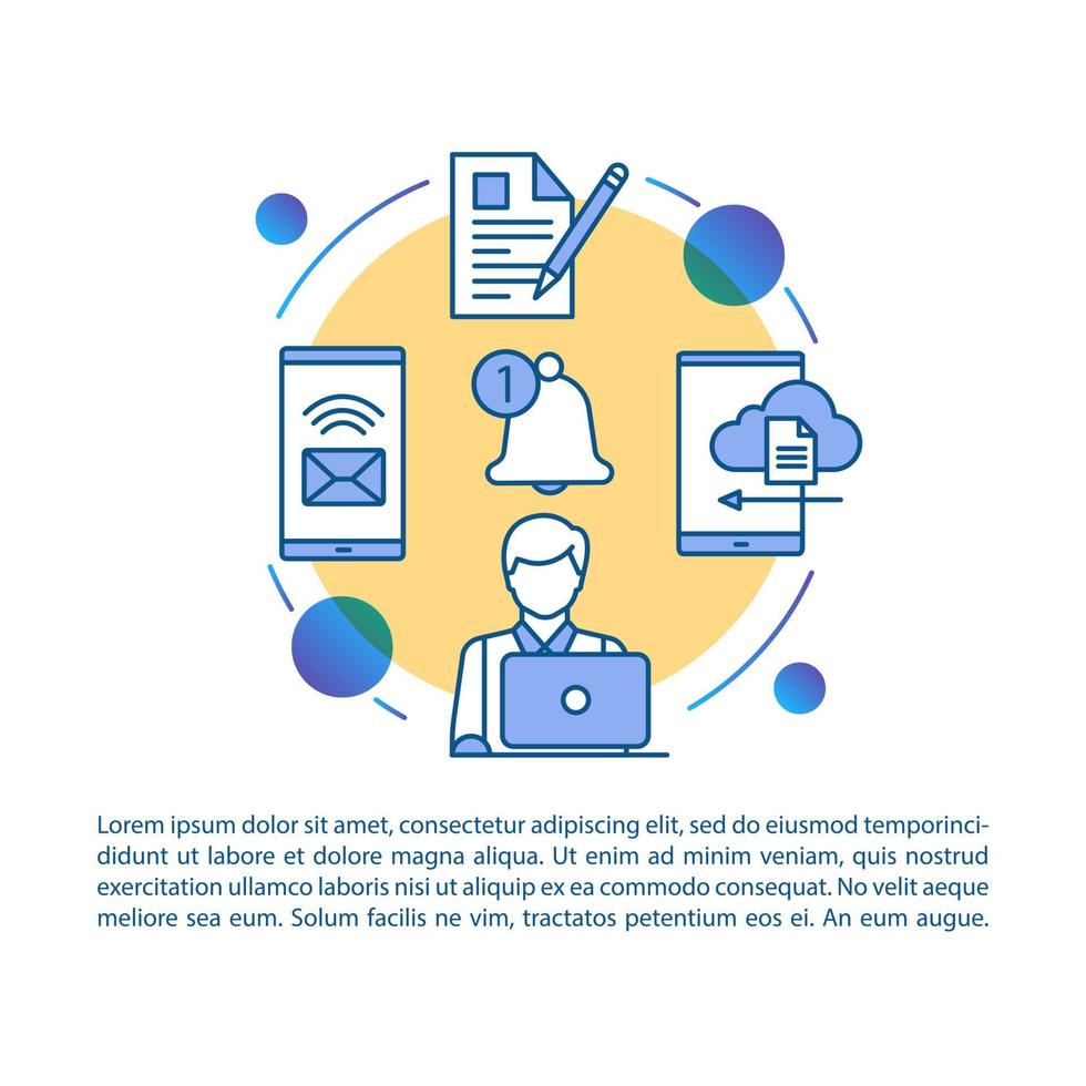 Email marketer article page vector template. Marketing specialty. Brochure, magazine, booklet design element with linear icons and text boxes. Print design. Concept illustrations with text space Pro Vector