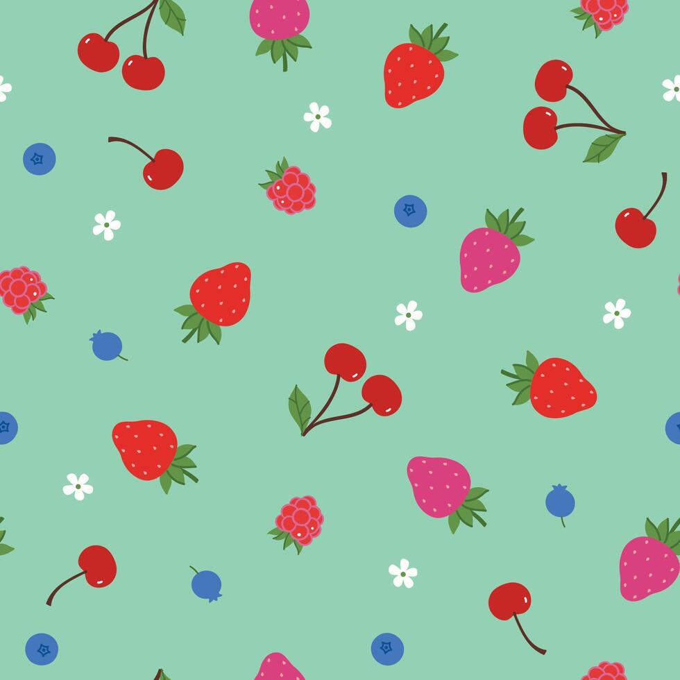 Seamless pattern with different berries on a green background. graphics. Pro Vector