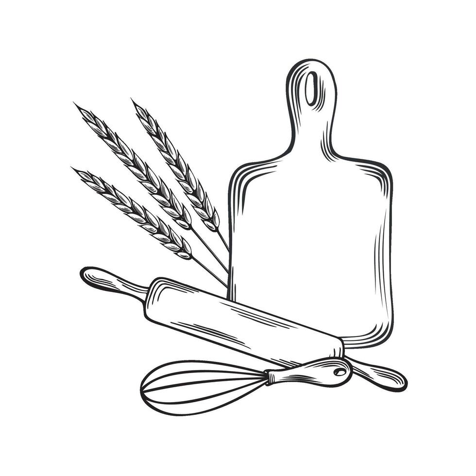 Kitchenware, baking tools. Ears of wheat. Cutting board, rolling pin and whisk. flat illustration linear, isolated. Wooden instrument. Template for wrapping, cookbook, menu, showcase, website. Pro Vector