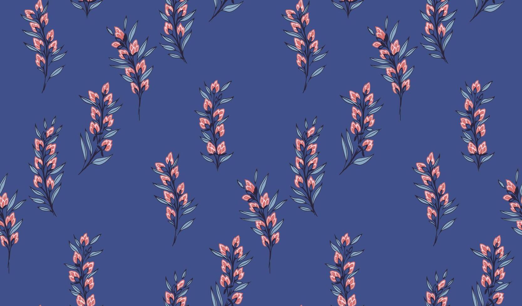Abstract, artistic branches with tiny buds flowers and small leaves scattered randomly in a seamless pattern. Blue background with creative wild floral stems printing. hand drawing sketch. Free Vector