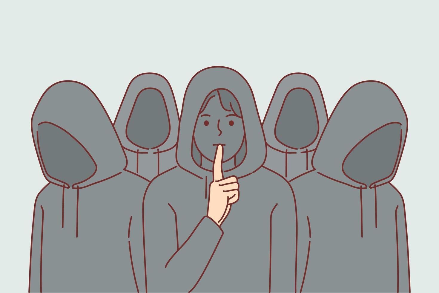 Group of hackers in hoods makes tss gesture, trying to commit cyber crimes without unnecessary noise Pro Vector