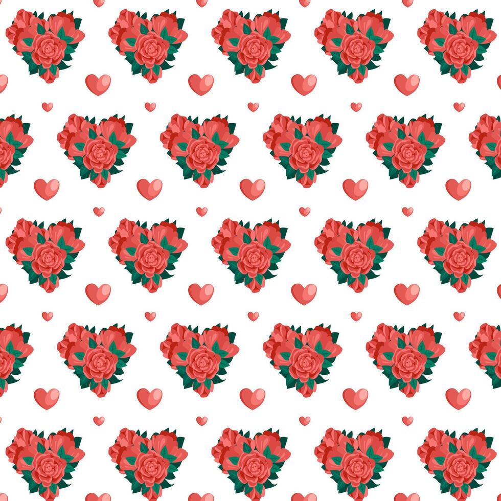 Valentines seamless pattern with red roses bouquets and hearts. White and red background abstract geometric pattern. Valentine day wrapping paper, concept for flyers and printing paper. Pro Vector