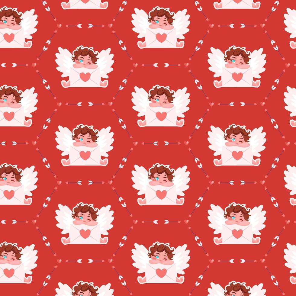 Valentines seamless pattern with cute cupid . Red background abstract geometric pattern. Valentine day wrapping paper, concept for flyers and printing paper. illustration Pro Vector