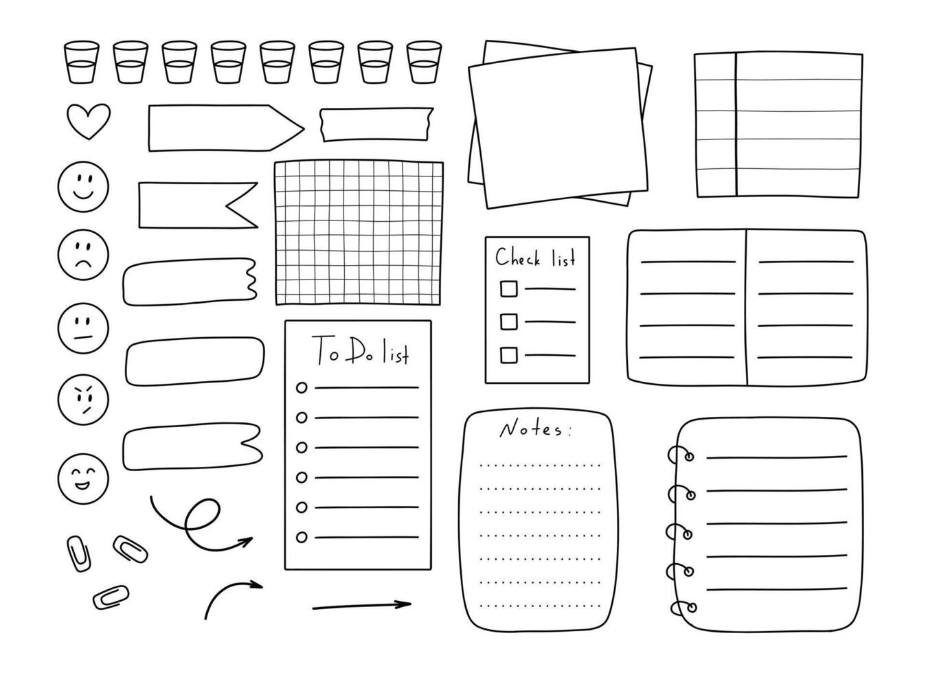 Task planners in doodle style. Cute paper notes, to-do lists, notepads, paper sheets, bookmarks. illustration. A set of sheets for notes. Pro Vector