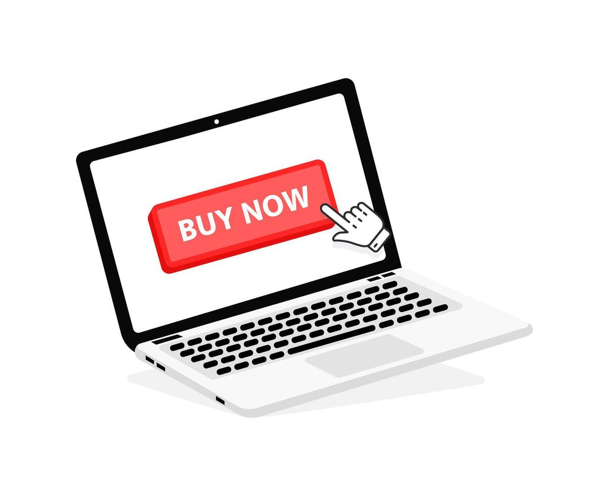 Buy now text on Laptop screen with a red button . Button with pointer clicking. Finger Pressing Pro Vector