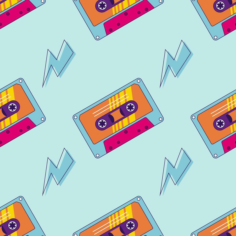 80s, 90s retro elements. Pattern with audio cassettes and geomitrical elements in the Memphis style Pro Vector
