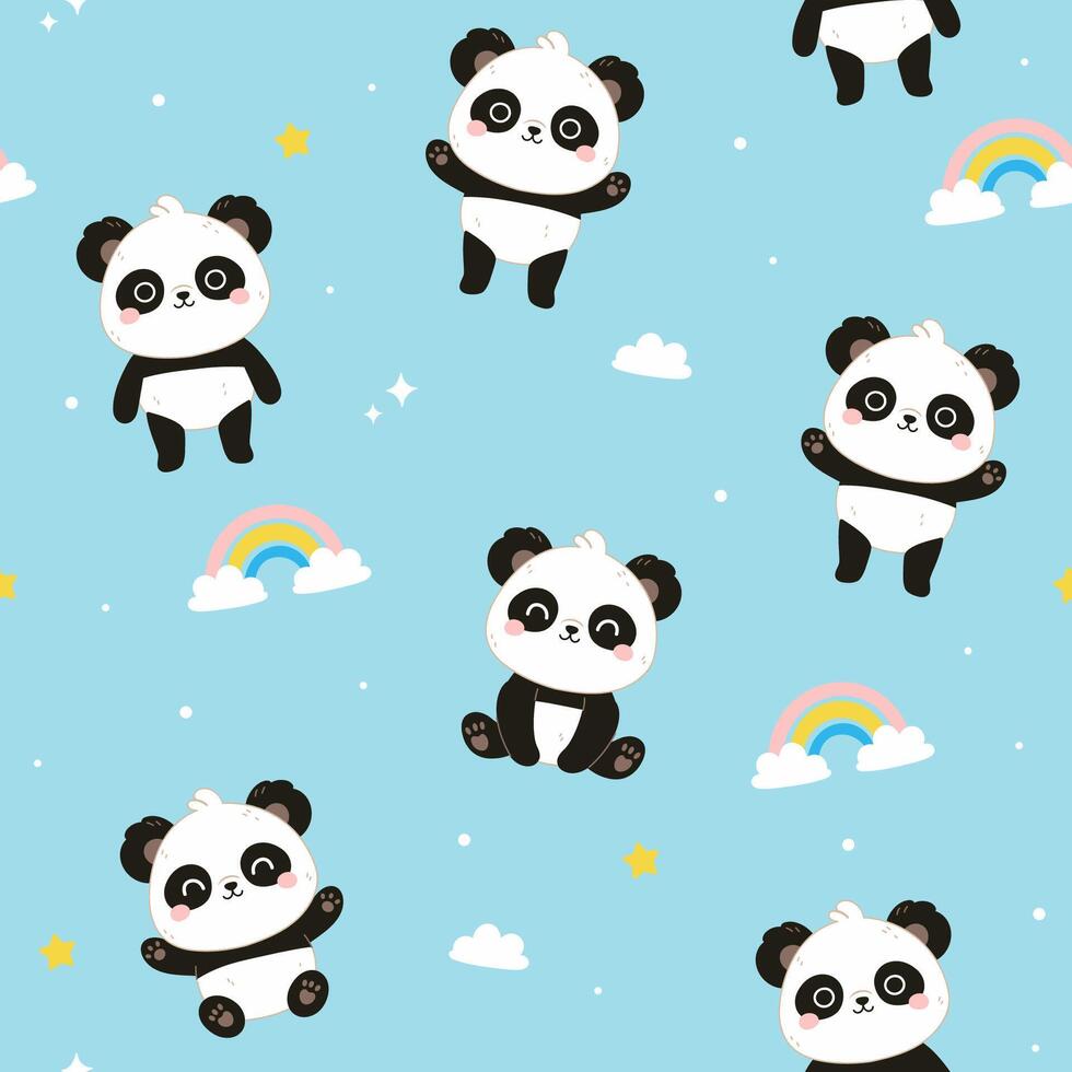 Seamless pattern with cute kawaii pandas, rainbows, clouds on a blue background. graphics. Pro Vector