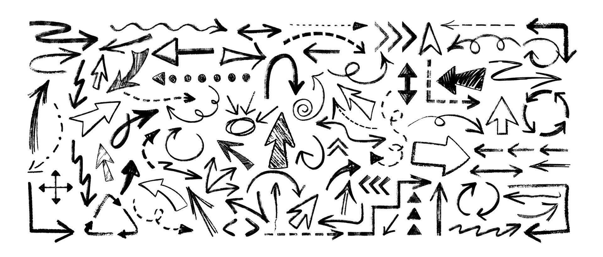 Hand drawing charcoal arrow set. Doodle direction pointer, curved strokes, cursor, dashed, circular and wave arrows. Black chalk pencil dash lines. Grunge crayon scribbles, scrawls painted with coal. Pro Vector