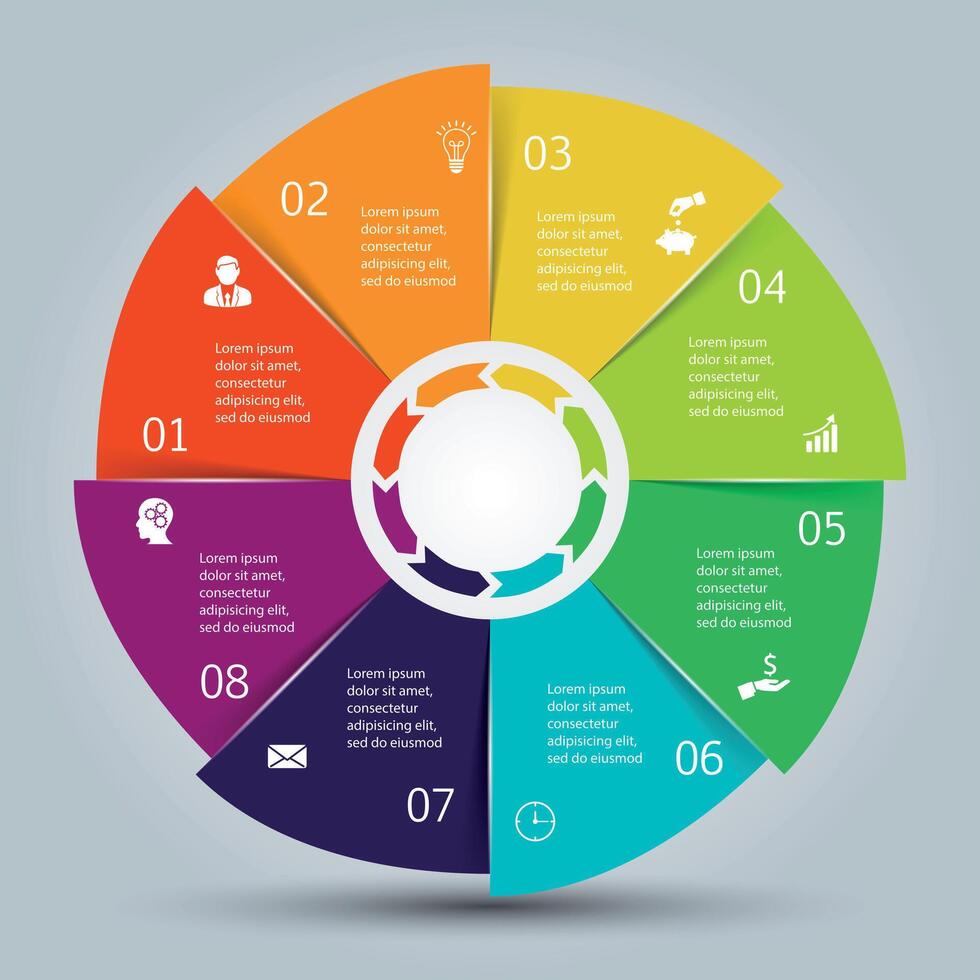 Circle elements for infographic. Template for cycling diagram, graph, presentation and round chart. Business concept with 8 options, parts, steps or processes. Pro Vector