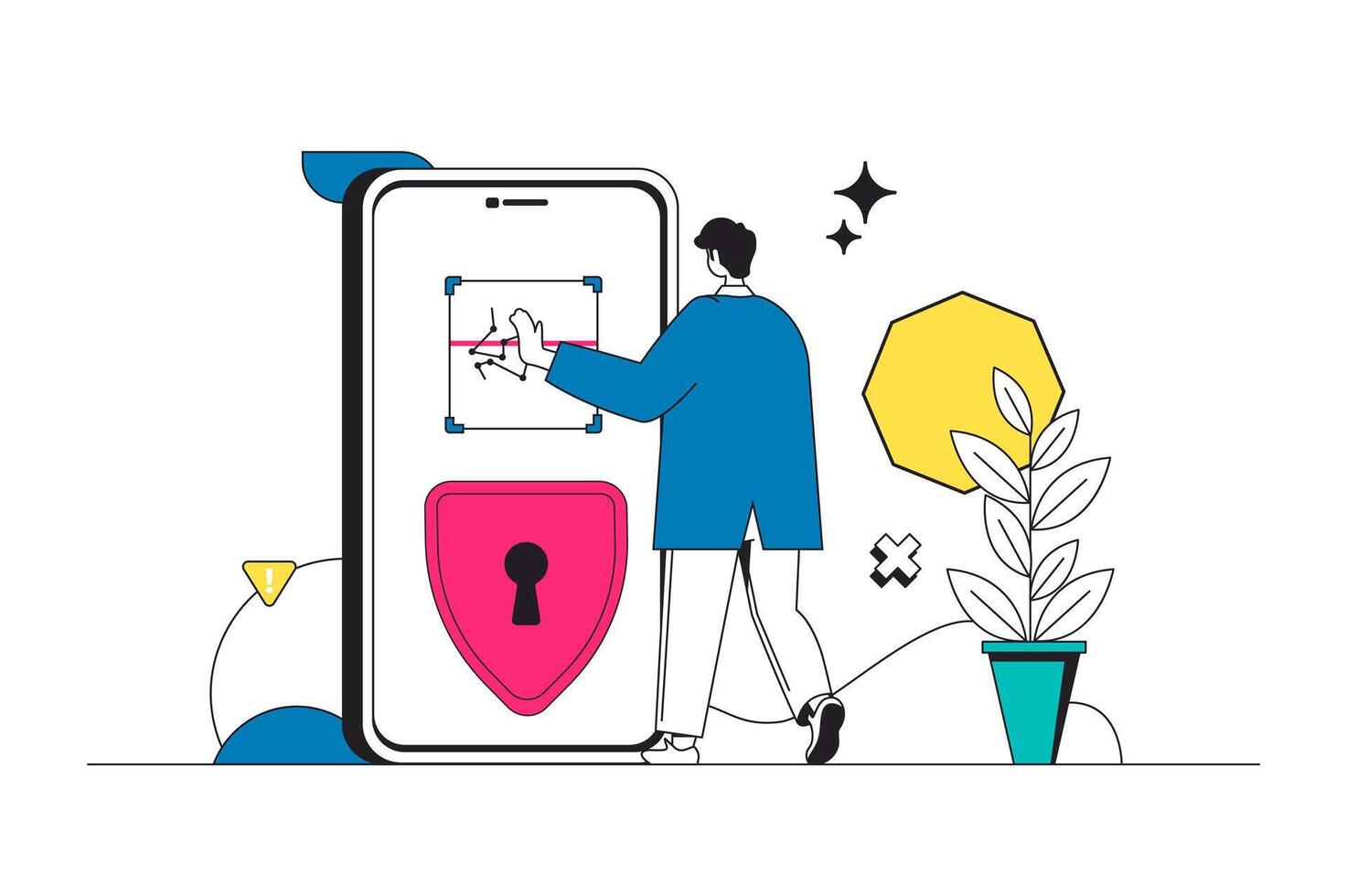Biometric control outline web concept in modern flat line design. Man unlocking mobile phone with password access and face recognition system, touch screen for fingerprint id. illustration Pro Vector