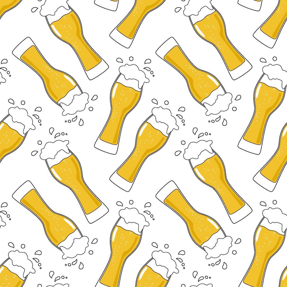 Patterning of draft beer mugs with foam on yellow background. Continuous repeat pattern Pro Vector