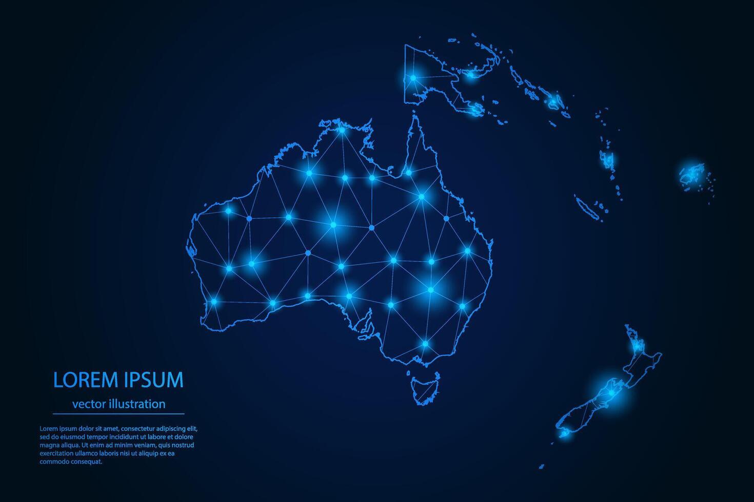 Abstract image Oceania map - With Blue Glow Dots And Lines On Dark Gradient Background, 3D Mesh Polygon Network Connection. Pro Vector