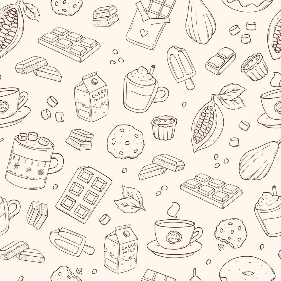 chocolate and cocoa elements seamless pattern with hand drawn chocolate bars, hot chcolate and hot cocoa cups, cacao fruits, cocoa beans, etc. EPS 10 Pro Vector
