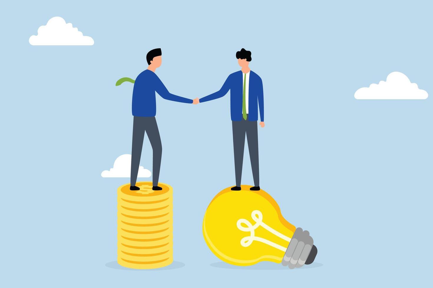 Idea pitching, businessman standing with light bulb idea, shaking hands with VC on stack of coins. Pro Vector