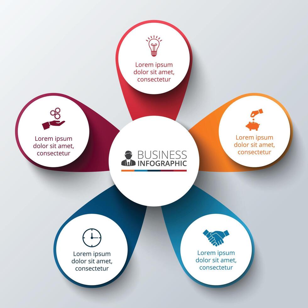 Circles infographic. Template for cycle diagram, graph, presentation and round chart. Business concept with 5 options, parts, steps or processes. Data visualization. Pro Vector
