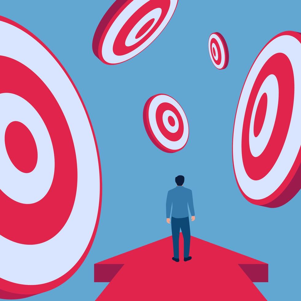 Man standing on arrow graphic selecting scattered targets, selection target illustration. Pro Vector
