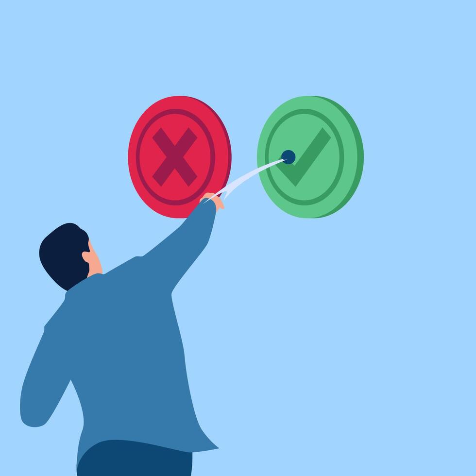 Man throws the ball to the green button which means accept, illustration for making a decision. Pro Vector