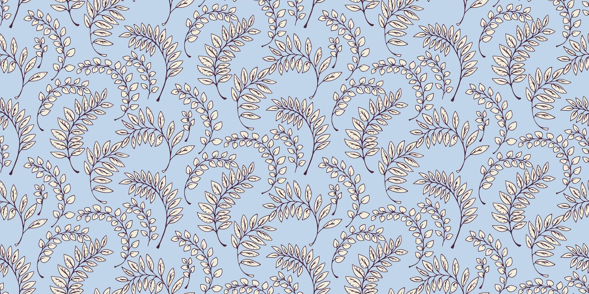 Pastel abstract lines branches leaves scattered randomly in a seamless pattern. hand drawing. Creative tiny leaf stems printing on a blue background. Template for design vector