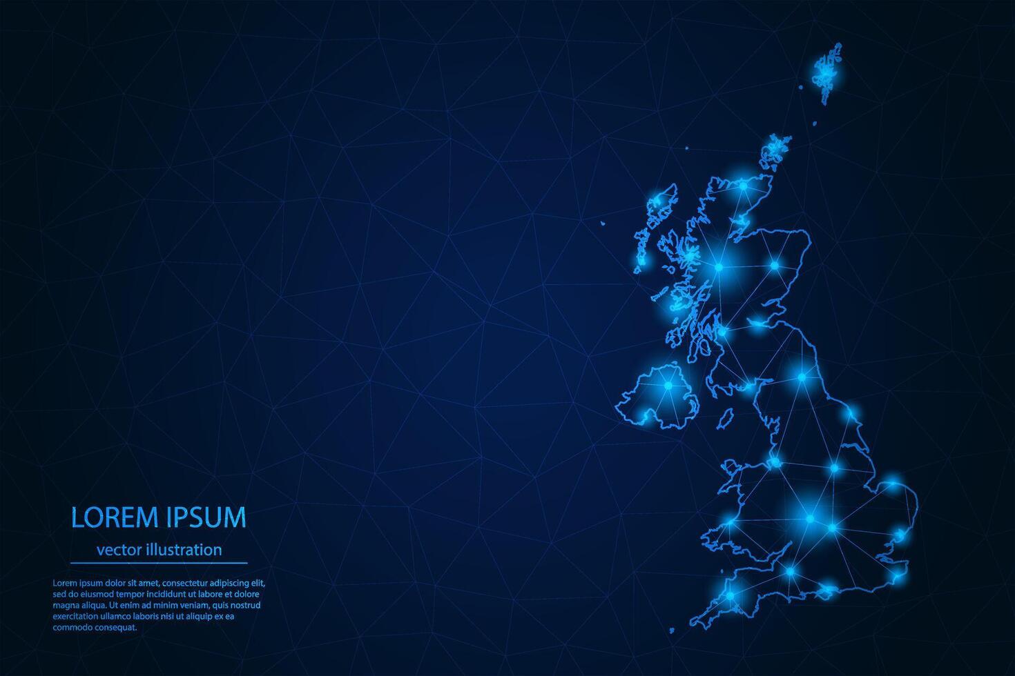 Abstract image United Kingdom map - With Blue Glow Dots And Lines On Dark Gradient Background, 3D Mesh Polygon Network Connection. Pro Vector