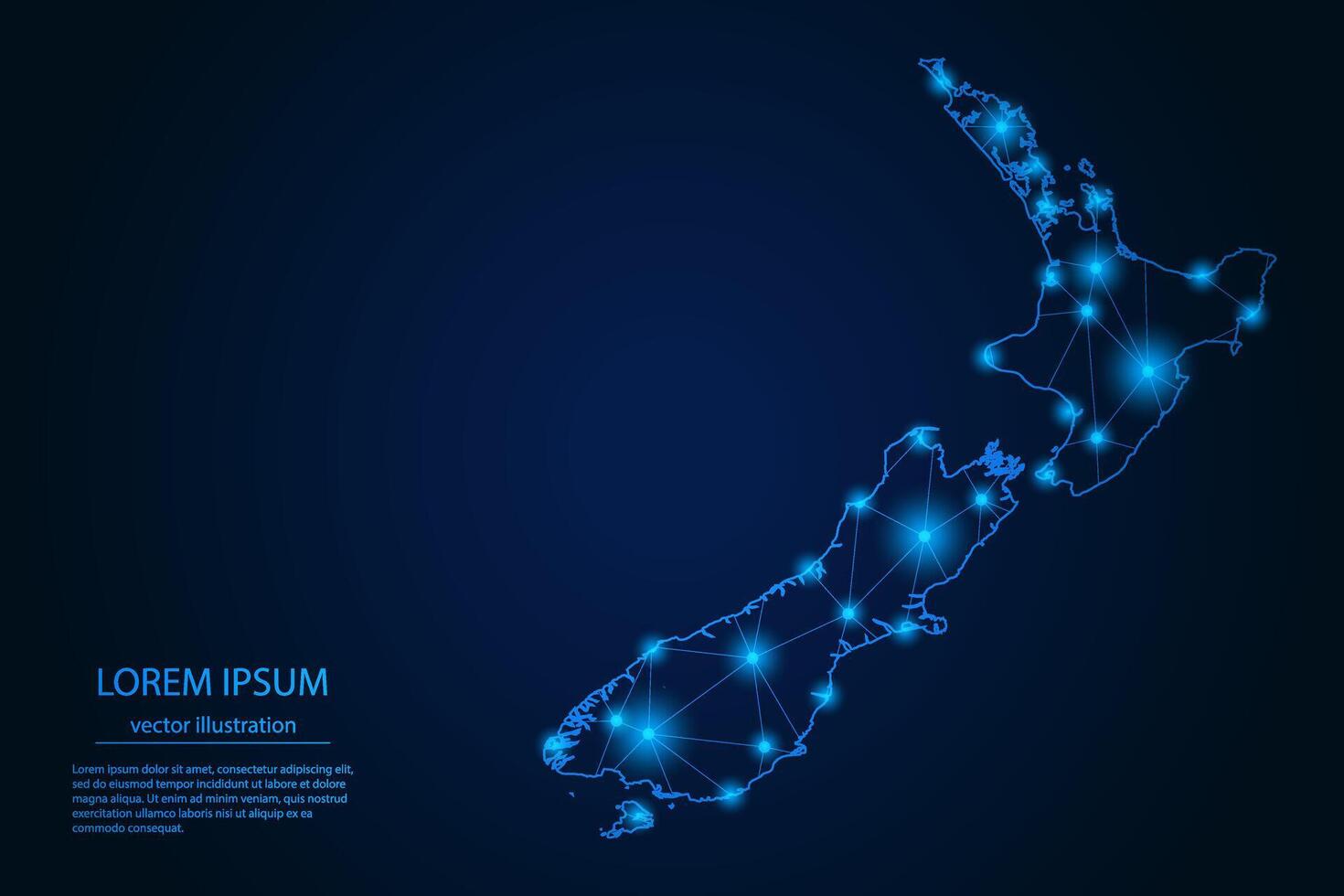 Abstract image New Zealand map - With Blue Glow Dots And Lines On Dark Gradient Background, 3D Mesh Polygon Network Connection. Pro Vector