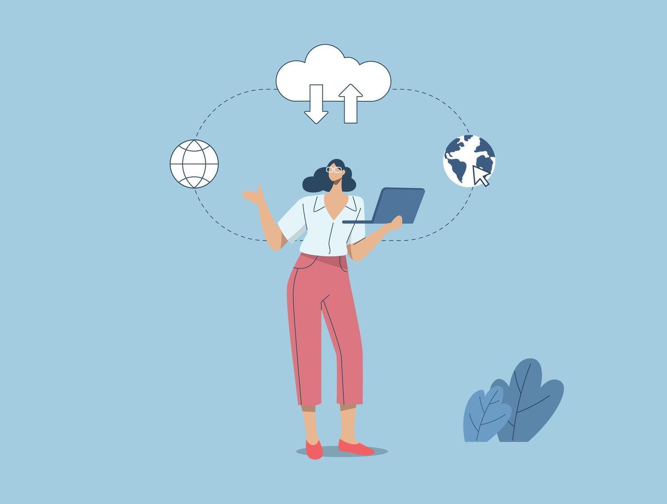 Secure connection, Storage of important data, and cloud technology, Cloud computing services business technology concept, Woman standing using laptop to work in social media. illustration. Pro Vector