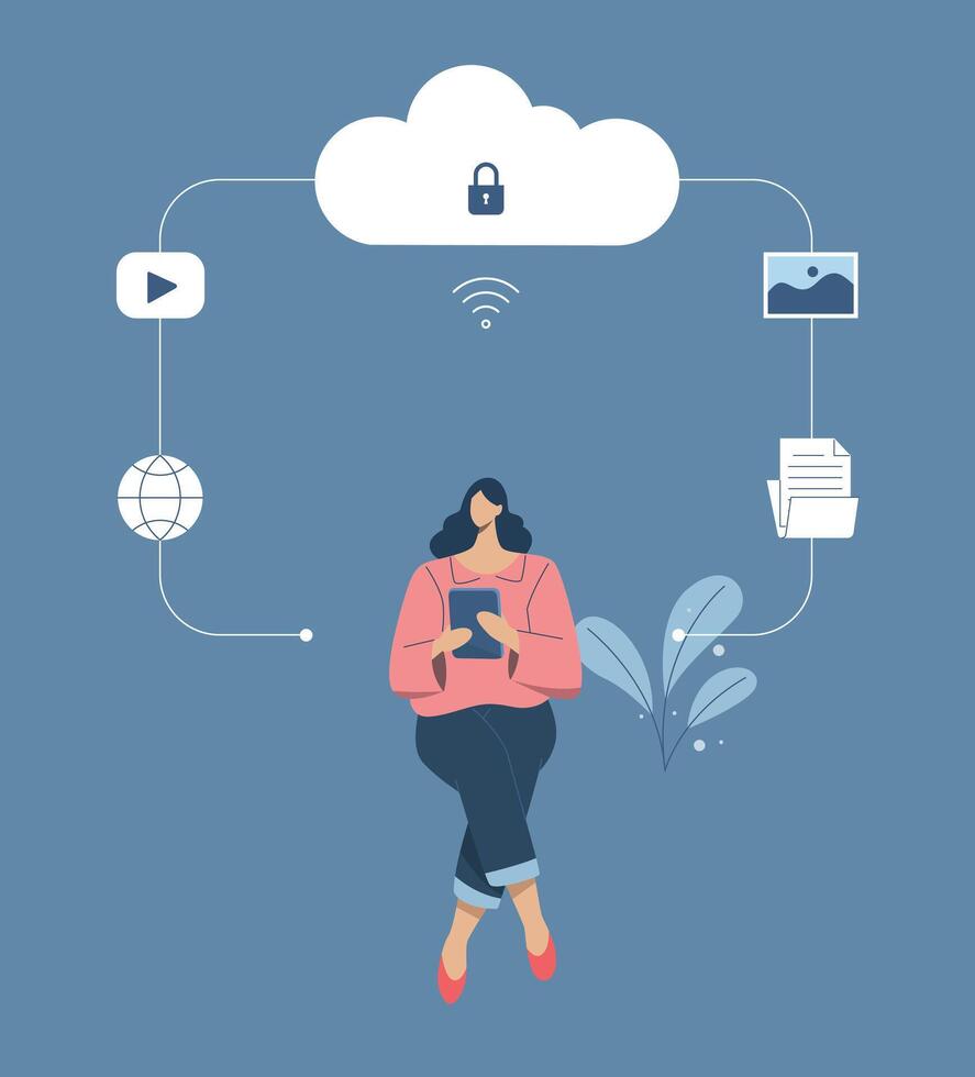 Protection of important personal databases, Secure cloud downloads and uploads, Personal security management concept, Woman using tablet online in social media. design illustration. Pro Vector