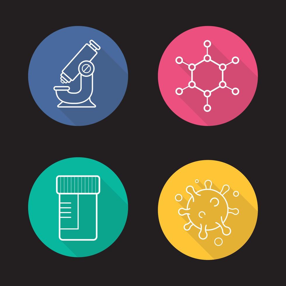 Science laboratory flat linear long shadow icons set. Microscope, molecule and virus structure, medical tests jar. Vector line symbols Pro Vector