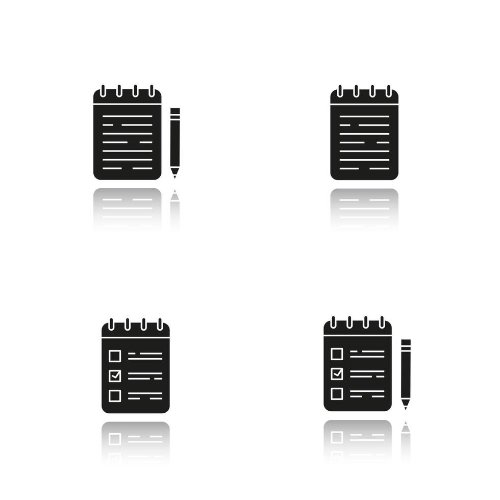 Notepads drop shadow black icons set. Notebooks and to do lists with pencils. Diary. Isolated vector illustrations Pro Vector