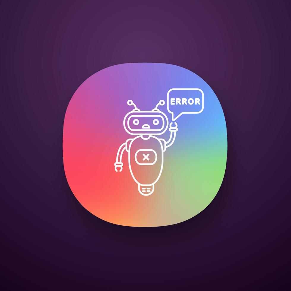 Error chatbot app icon. UI UX user interface. Talkbot with error in speech bubble. Online customer support. Virtual assistant. Modern robot. Web or mobile application. Vector isolated illustration Pro Vector