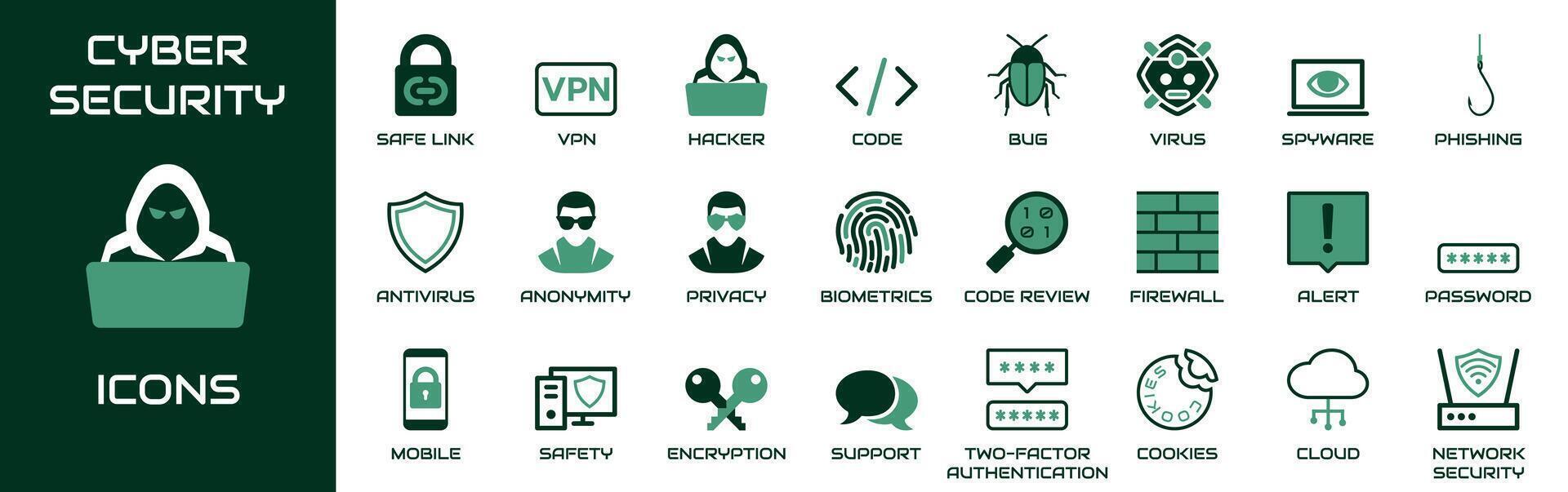 Cybersecurity icon set. Collection contains safe link, hacker, VPN, code, bug, virus, spyware, phishing, antivirus, anonymity, privacy, biometrics, encryption and other icons. Pro Vector