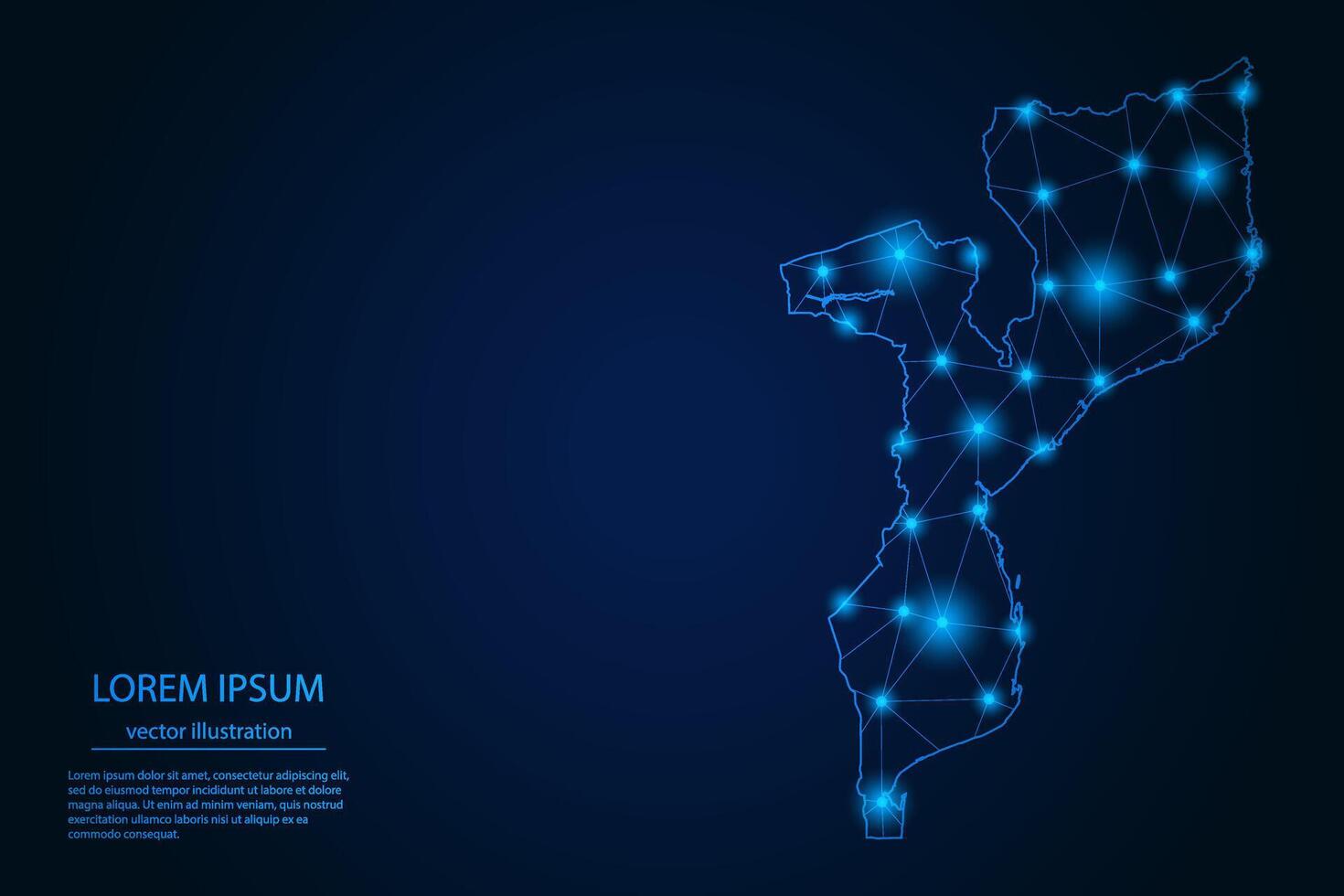 Abstract image Mozambique map - With Blue Glow Dots And Lines On Dark Gradient Background, 3D Mesh Polygon Network Connection. Pro Vector