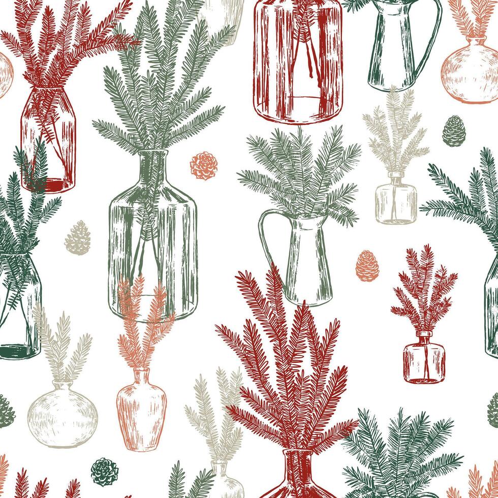 Ornament of jars with fir tree branches and cones. Christmas tree twigs in vases. Abstract seamless pattern. Retro style design. Pro Vector