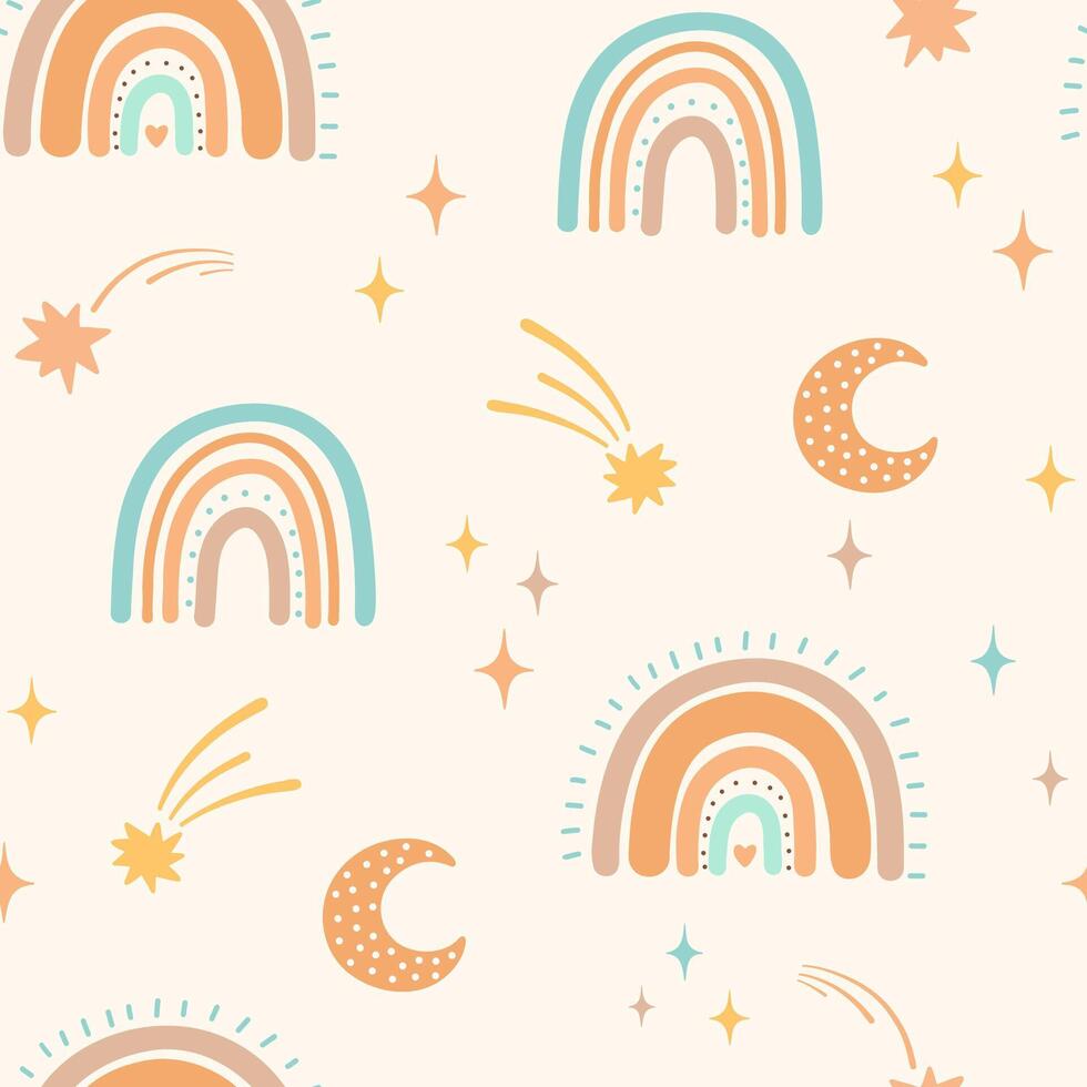 Bohemian baby pattern on beige background. Seamless pattern in boho style with moon, shooting star and rainbow for textiles or fabric for newborns Pro Vector