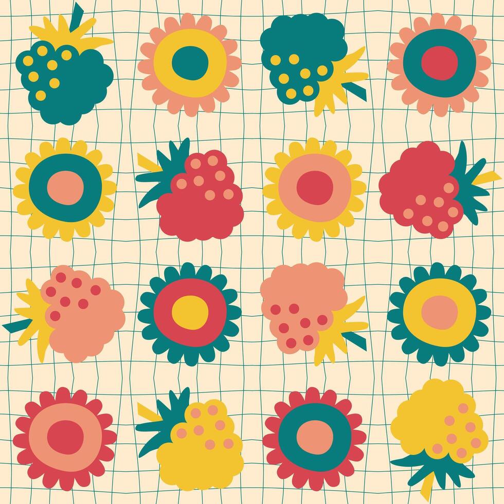 Groovy seamless pattern with daisy flowers and raspberries on grid distorted background. Hippie aesthetic print for fabric, paper, textile. Hand drawn illustration. Pro Vector