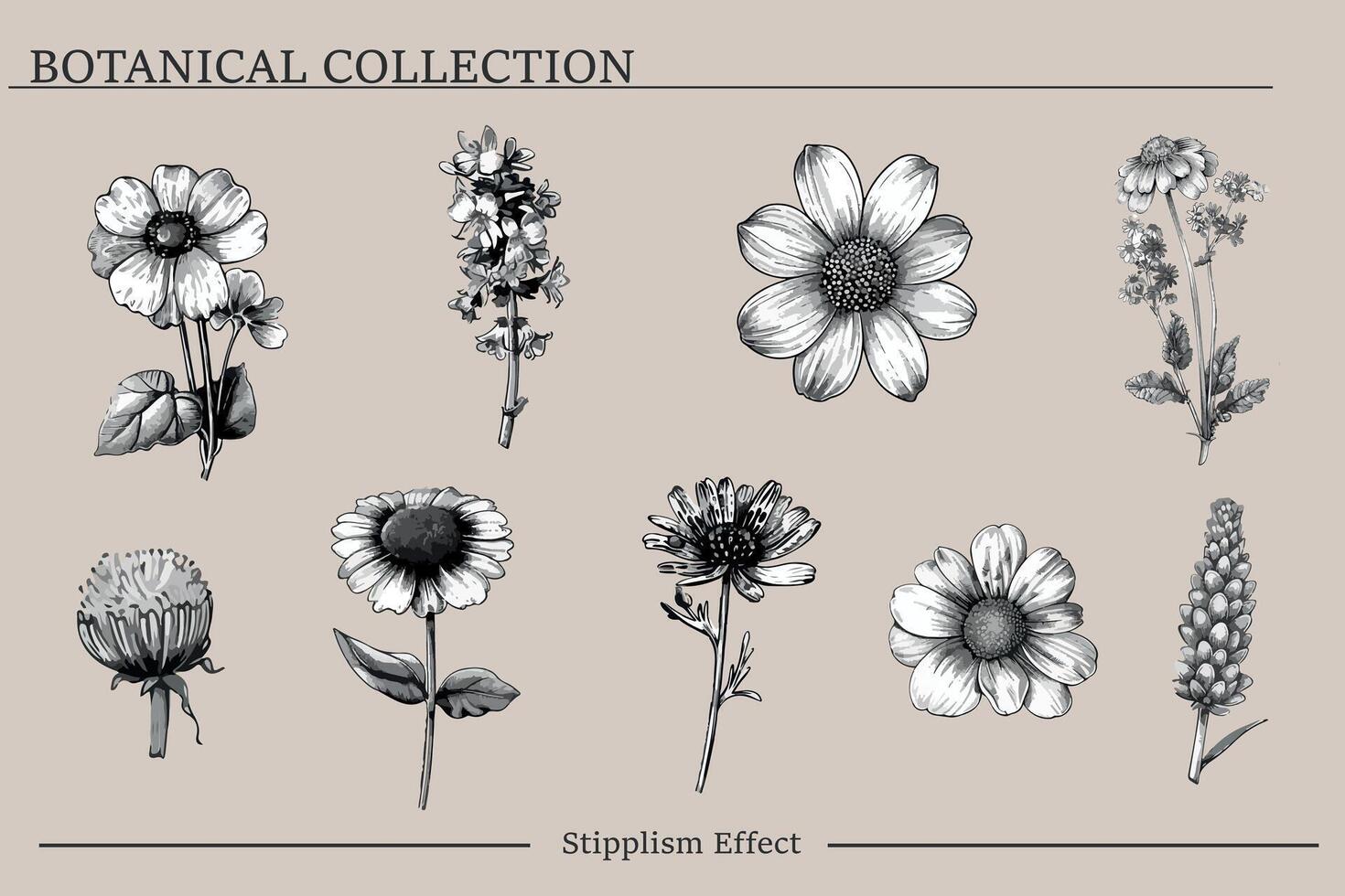 Set flowers with photocopy stipple effect elements. Y2K elements collection with grunge noise texture for poster design, covers, T-shirts, web design, collages. Pro Vector