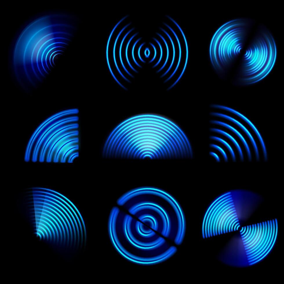 Wifi light effect. Internet router wifi blue neon radial waves. Sound scan glowing signal. Cellphone hotspot wireless technology set Pro Vector